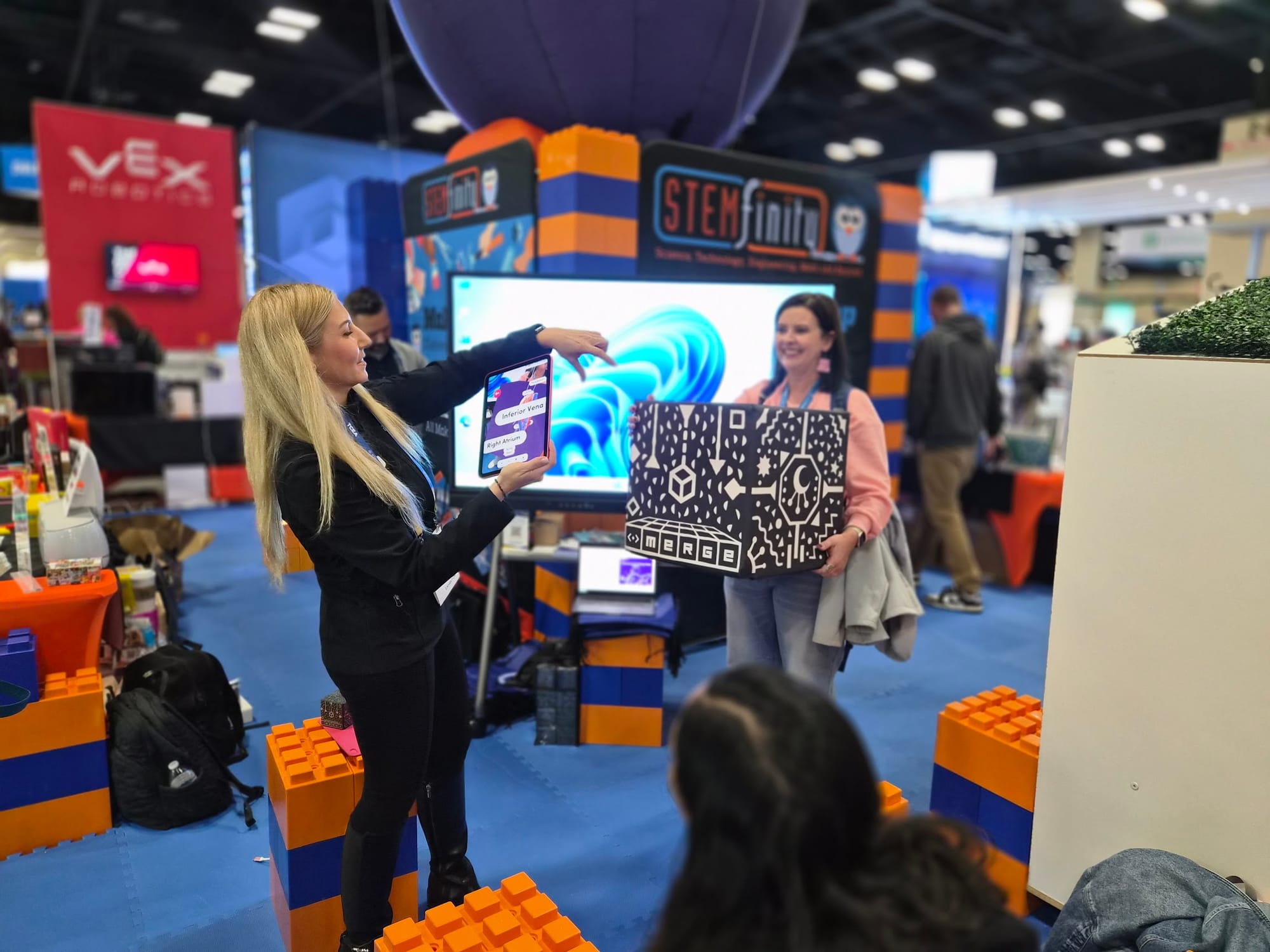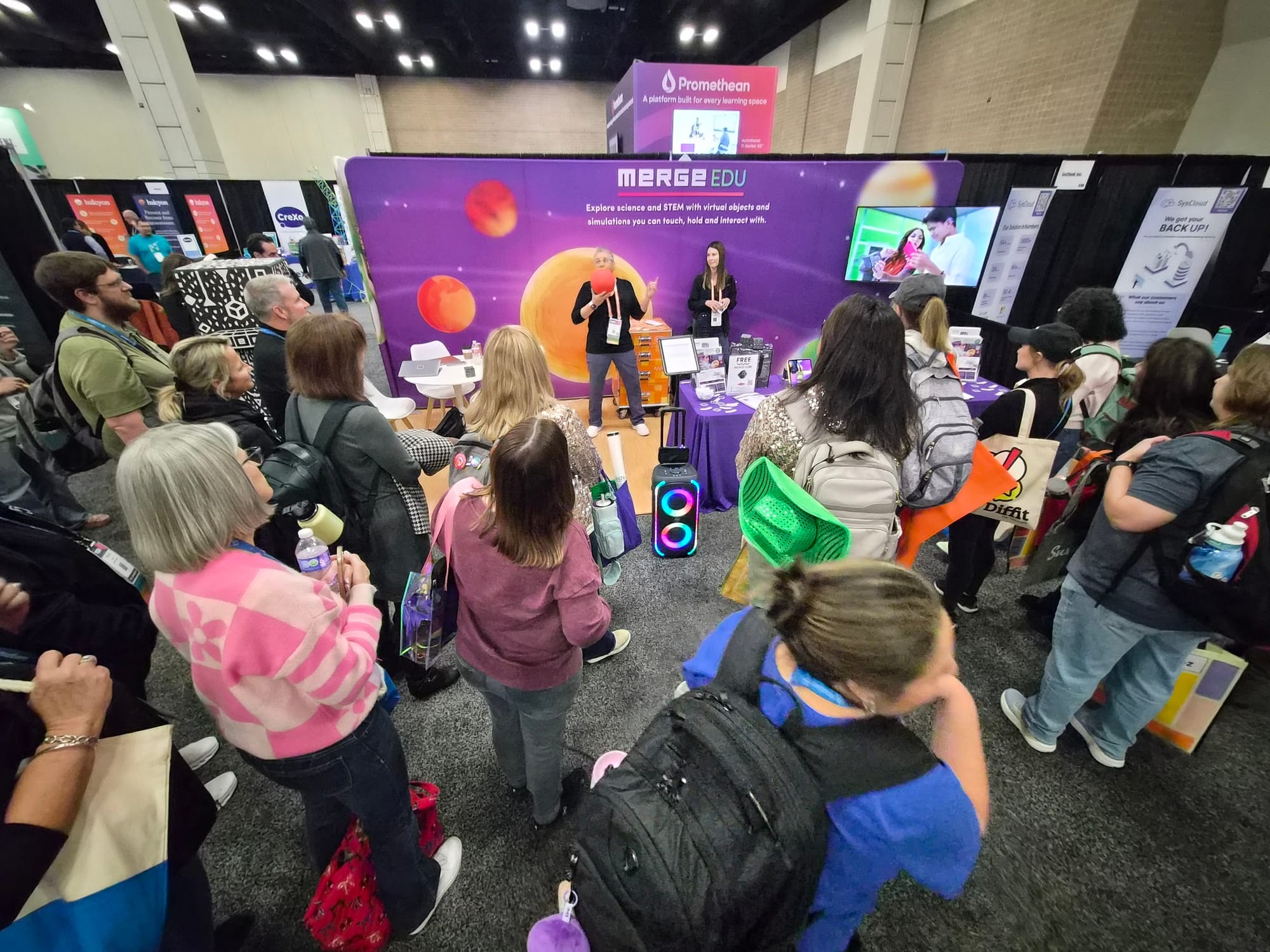 At our booth, teachers, librarians, instructional coaches, and district leaders experienced live demos of Merge EDU across science, STEM, library, and enrichment use cases. Many visitors were seeing the Mega Merge Cube for the first time—its larger-than-life presence drawing people in and sparking conversations about collaboration, flexible seating, and community engagement.